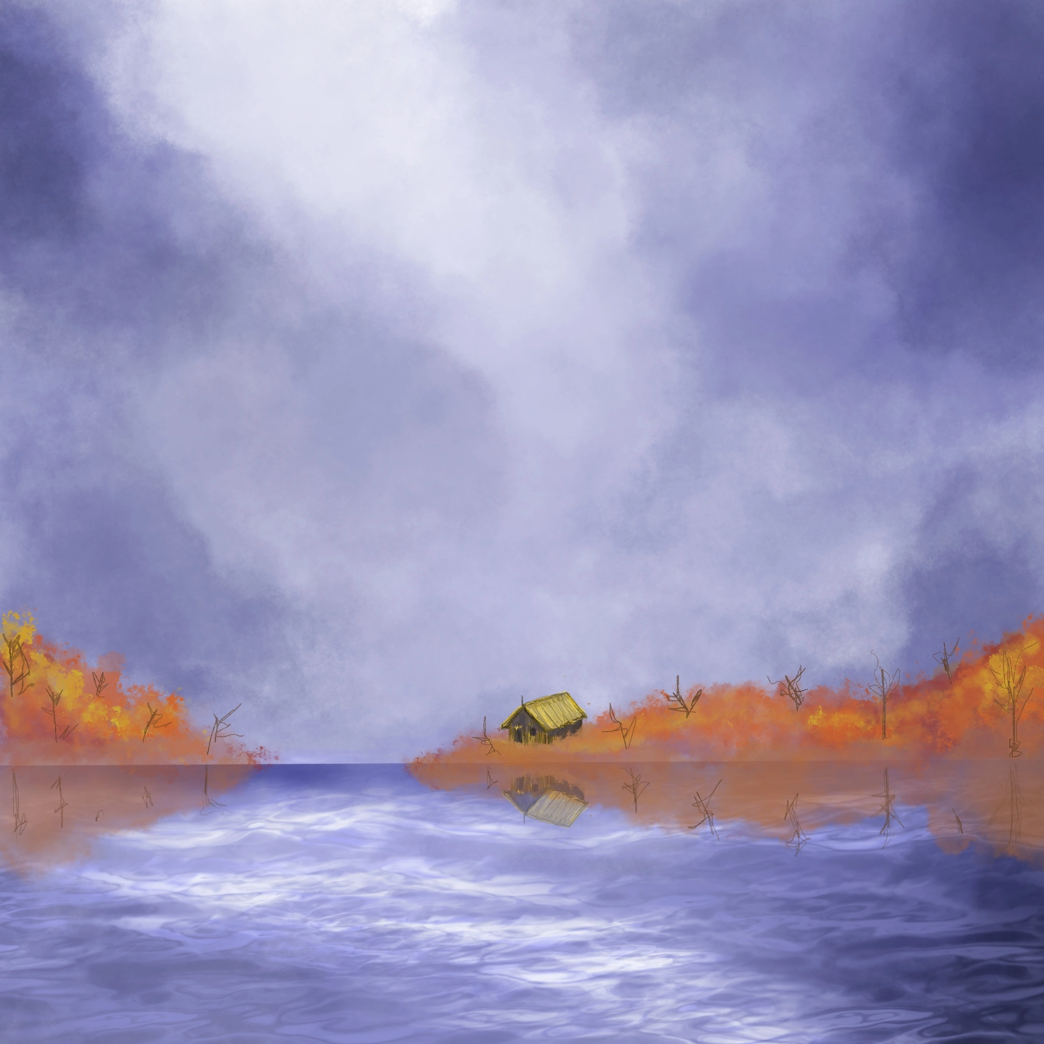 A golden-roofed cabin stands at the edge of still waters, watching the fire-colored hills burn with autumn’s final breath. In Burning Hills, the clash between serenity and intensity unfolds in rich purples, blazing oranges, and the cool reflection of a silent lake. It’s a landscape suspended between seasons, between calm and chaos.